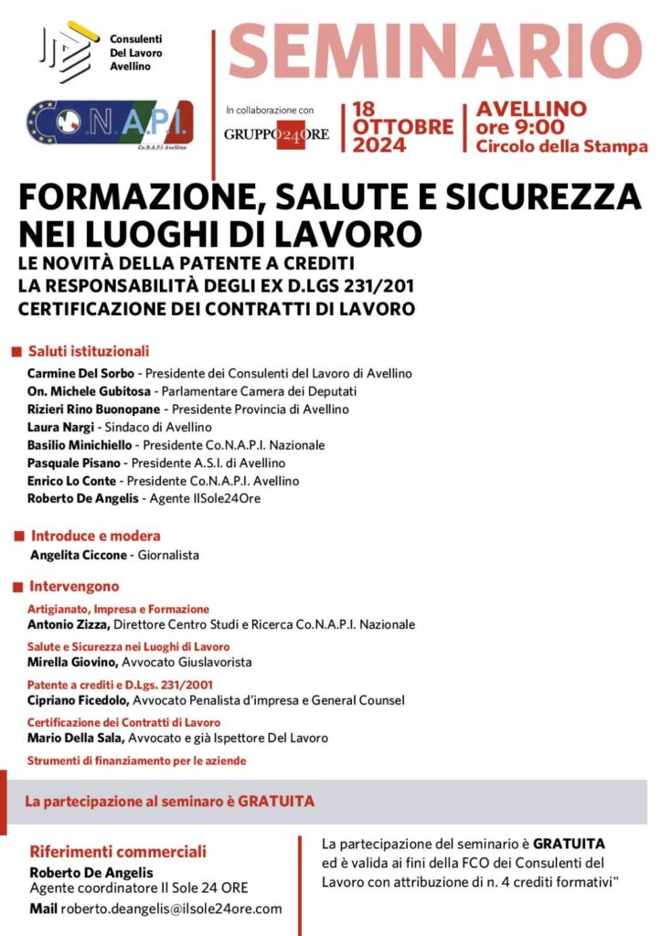 Il 18 ottobre 2024 si terrà ad Avellino, presso il Circolo della Stampa ad Avellino, un importante seminario dal titolo “Formazione, salute e sicurezza nei luoghi di lavoro. Responsabilità degli enti ex D.Lgs. 231/2001 e le novità della patente a crediti”. L’evento, avrà inizio alle ore 9.00 e rappresenta un’occasione preziosa per affrontare tematiche di grande attualità e rilevanza nel mondo del lavoro, quali la sicurezza nei luoghi di lavoro, le responsabilità degli enti in base al D.Lgs. 231/2001, e le recenti novità legate all’introduzione della patente a crediti.