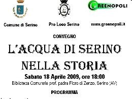 Sabato 18 aprile, a partire dalle ore 18 presso la Biblioteca Comunale di Serino, si terrà il convegno dal titolo “L’Acqua di Serino nella Storia”. L’incontro è organizzato dal portale web Greenopoli in collaborazione con la Pro Loco ed il Comune di Serino. Diversi sono gli interventi previsti: “L’Acquedotto Augusteo Serino-Napoli-Miseno” a cura di Giovanni De Feo, docente e ricercatore dell’Università di Salerno; “La Piscina Mirabilis”, a cura di Sabino De Gisi, dottorando di ricerca presso la Facoltà di Ingegneria dell’Università degli Studi di Salerno; “L’Antico Acquedotto Serino-Benevento”, a cura di Carmela Malvano, dottoranda di ricerca presso la Facoltà di Ingegneria dell’Università degli Studi di Salerno.