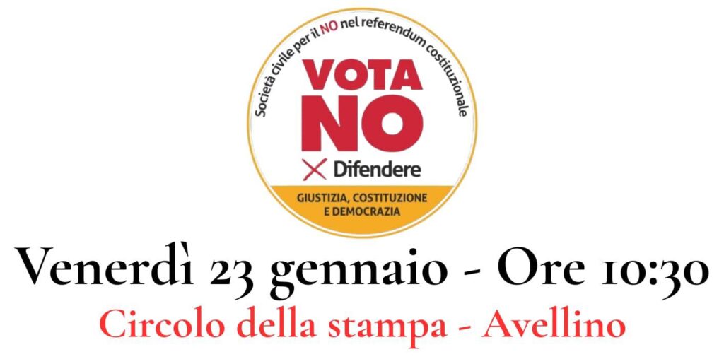 Venerdì 23 gennaio, alle ore 10:30, presso il Circolo della Stampa, si terrà la conferenza stampa di presentazione del Comitato Irpino – Società Civile per il NO, un’iniziativa nata dal basso per “promuovere informazione, consapevolezza e impegno civico in difesa della Costituzione”.