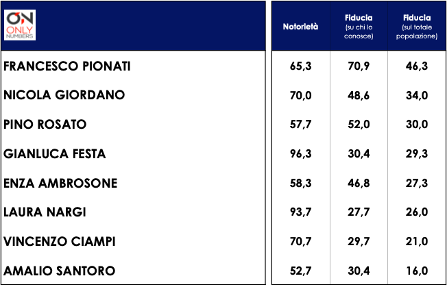 Il sondaggio prende in esame anche un’ipotesi di primo turno elettorale. Alla domanda su chi voterebbero come sindaco, al primo turno vincerebbe Nicola Giordano con una coalizione progressista composta da Partito Democratico, Movimento 5 Stelle, Alleanza Verdi Sinistra e liste civiche di centrosinistra, con il 45,5%. Seguono Francesco Pionati come candidato civico e Laura Nargi sostenuta dall’intero centrodestra. In un eventuale secondo turno, Pionati risulterebbe vincitore. Nell’ipotesi di uno scontro diretto tra campo largo e centrodestra, con Nicola Giordano e Laura Nargi come candidati principali, vincerebbe nettamente Giordano.
