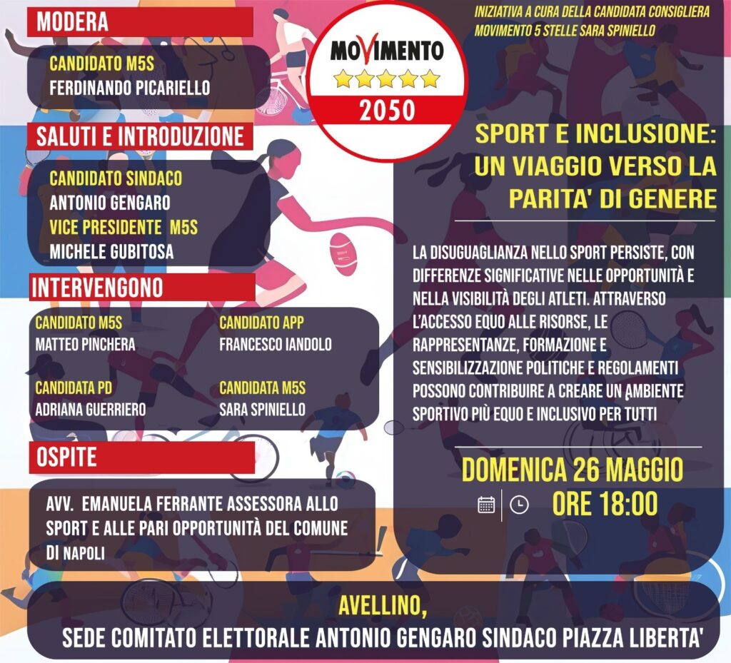 Il Movimento 5 Stelle da appuntamento a domenica 26 maggio 2024 alle ore 18 presso la sede di Antonio Gengaro Sindaco a Piazza Libertà ad Avellino per un convegno dal titolo “Sport e inclusione: un viaggio verso la parità di genere” ed ideato dalla candidata consigliere per il Movimento 5 Stelle Sara Spiniello. Ospite speciale l’avvocato Emanuela Ferrante,A ssessore alle Sport e alle Pari Opportunità del Comune di Napoli.