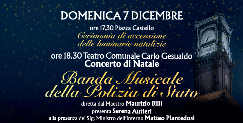 Alle 18:30, invece, il Natale entrerà nel vivo con il Concerto di Natale della Banda Musicale della Polizia di Stato, diretta dal Maestro Maurizio Billi, in programma al Teatro Comunale Carlo Gesualdo. Un evento di grande prestigio che vedrà la presenza del Ministro dell’Interno Matteo Piantedosi e del Capo della Polizia Vittorio Pisani, con la conduzione dell’artista Serena Autieri.