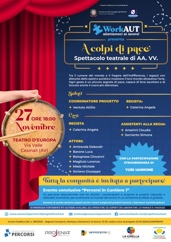 Si terrà giovedì 27 novembre alle ore 18:00 al Teatro d’Europa di Cesinali lo spettacolo teatrale “A colpi di pace”, evento finale della prima fase del progetto WorkAUT: Alleniamoci al lavoro!, finanziato dalla Regione Campania con DD. n. 535/2024. Il progetto, ideato per favorire la formazione e l’inclusione lavorativa di giovani con disturbo dello spettro autistico, ha come obiettivo principale quello di valorizzare le competenze individuali attraverso percorsi personalizzati di crescita e scoperta dei talenti.