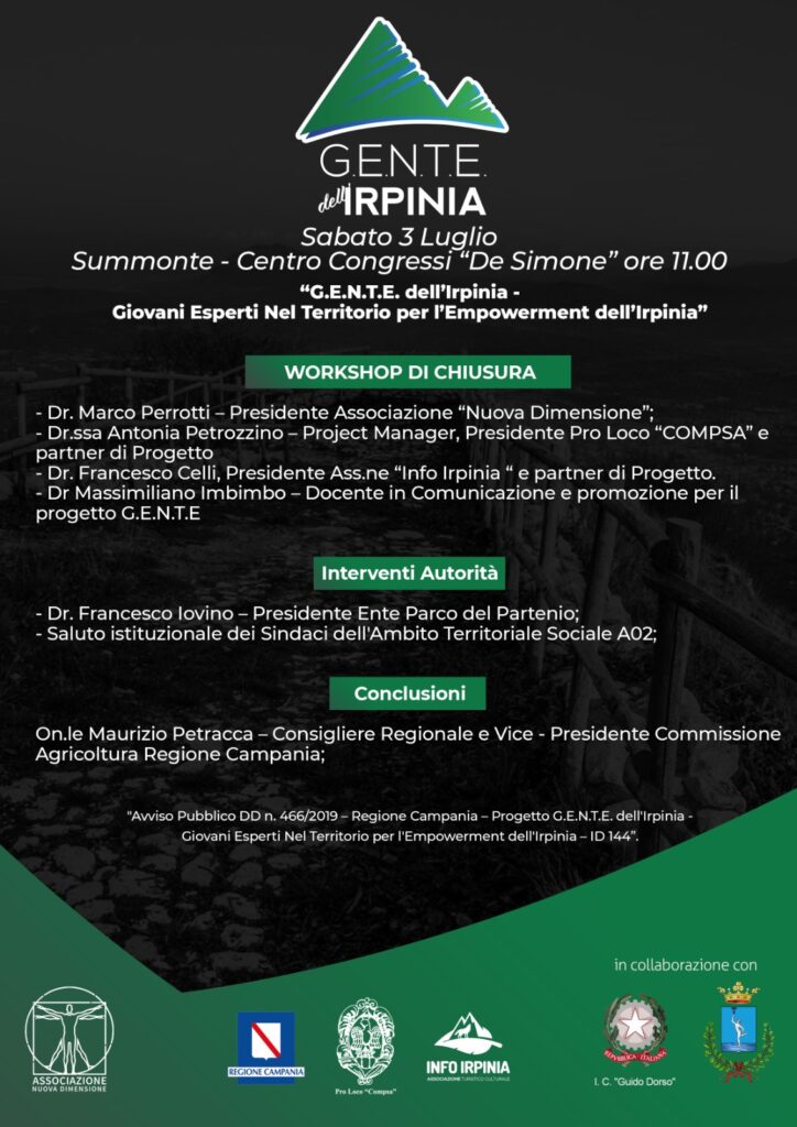 Sabato 3 Luglio a partire dalle 11 l’Associazione “Nuova Dimensione” organizza a Summonte, presso il Centro Congressi “A. De Simone”, un workshop di presentazione del suo progetto “G.E.N.T.E. dell’Iirpinia – giovani esperti nel territorio per l’empowerment dell’Irpinia”, finanziato al 70% dalla Regione Campania.