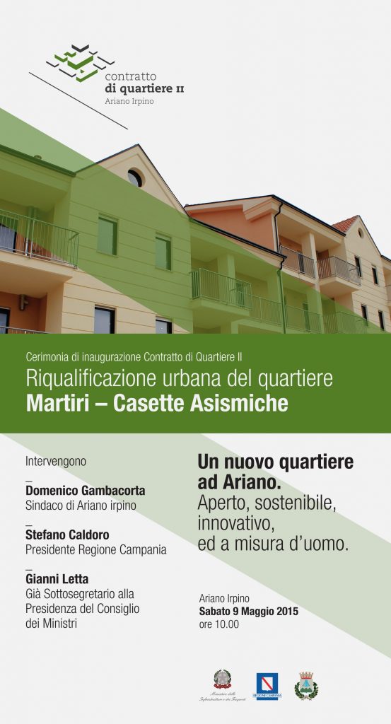 L’Amministrazione Comunale racconta in un opuscolo, appositamente realizzato, il lungo e complesso percorso finalizzato alla riqualificazione urbana del Quartiere Martiri (realizzato nell’ambito del programma Contratto di Quartiere II), ex casette asismiche, iniziato nel luglio 2004, che ha portato alla realizzazione di un nuovo quartiere ad Ariano, con la caratteristica di essere aperto, sostenibile, innovativo ed a misura d’uomo. È stato il finanziamento più consistente nel quinquennio di mandato: circa 13 milioni di euro, di cui nove milioni e mezzo da fondi del Ministero delle Infrastrutture, 900 mila euro circa da fondi della Regione Campania e 2 milioni e seicento mila da fondi comunali.
