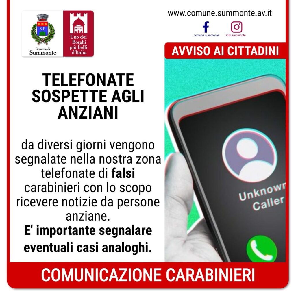 “Da diversi giorni vengono segnalate nella nostra zona telefonate di falsi Carabinieri con lo scopo di ricevere notizie da persone anziane. E’ importante segnalare eventuali casi analoghi”. La comunicazione arriva dal Comune di Summonte che avvisa la cittadinanza di segnalare eventuali telefonate sospette ad anziani e persone fragili.