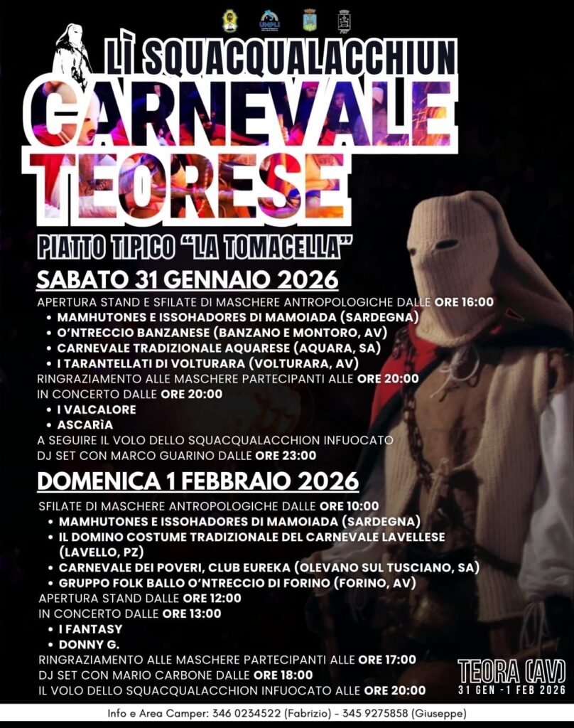 Oggi, 31 gennaio, Teora entra nel cuore della sua tradizione più profonda con l’apertura del Carnevale Teorese “Lì Squacqualacchiun”, uno degli eventi identitari più attesi dell’Irpinia. Un Carnevale che non si limita alla festa, ma si fa rito collettivo, memoria condivisa e partecipazione.