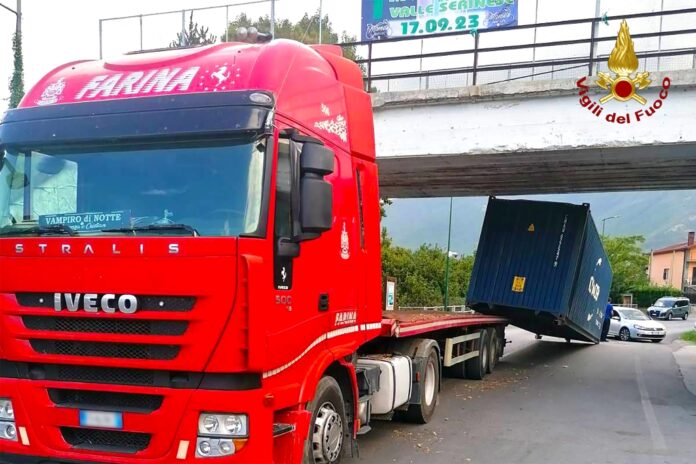 I Vigili del Fuoco di Avellino, subito dopo le ore 11:00 di oggi 5 settembre, sono intervenuti a Serino sulla SS 574 via Terminio dove un autoarticolato partito da Salerno e diretto a Campobasso si era incastrato sotto al ponte della linea ferroviaria Avellino – Salerno, perdendo il container che trasportava.