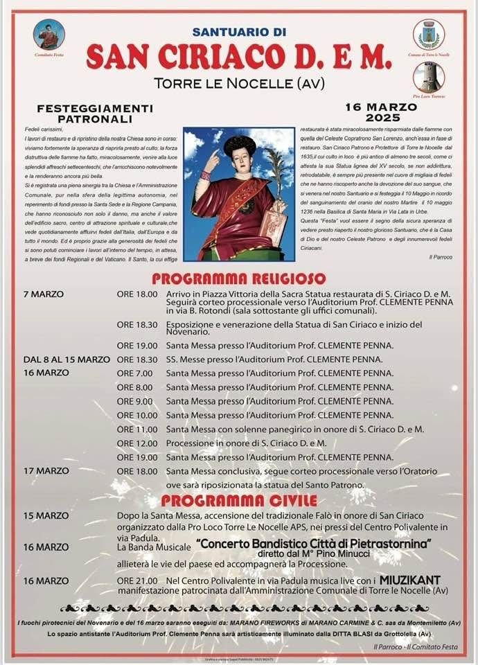 Oggi, 16 marzo, la comunità di Torre Le Nocelle celebra con grande devozione il Santo Patrono San Ciriaco di Roma, in occasione del suo martirio, che avvenne proprio il 16 marzo. Una giornata ricca di eventi religiosi e civili, che unisce tutta la cittadinanza in segno di fede e tradizione.