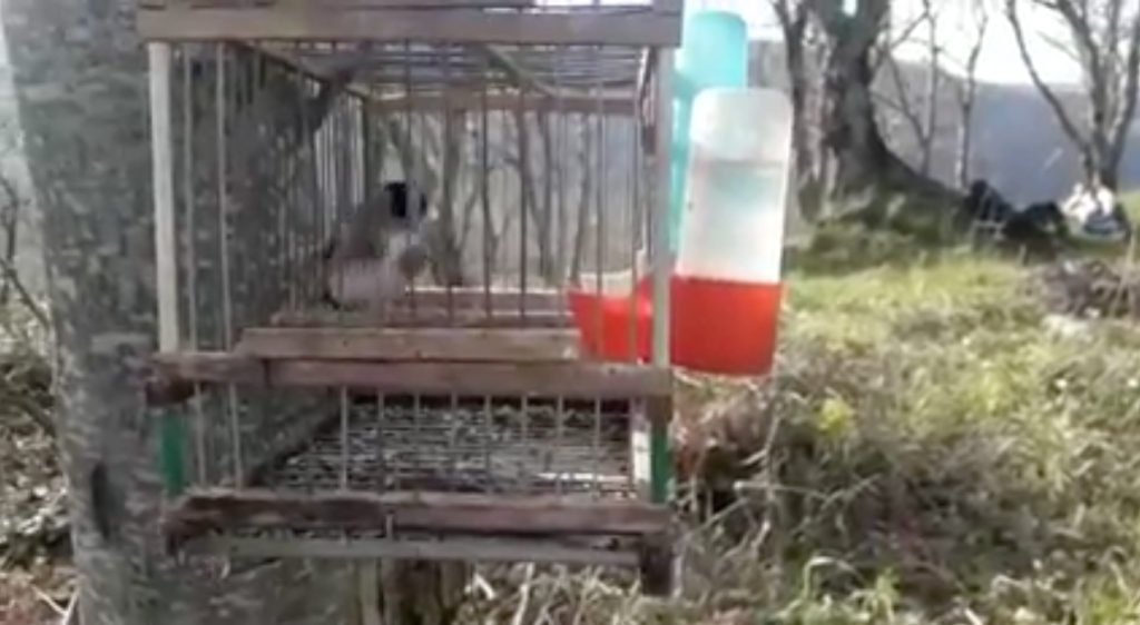 L’attesa non è stata vana, infatti, dopo alcune ore è giunta sul posto un auto con a bordo due soggetti. Gli stessi, non accorgendosi delle guardie zoofile nascoste, hanno posizionato nei pressi di una postazione alcuni richiami vivi, nello specifico esemplari di Cardellino e Lucherino mentre un altro Cardellino era utilizzato come “zimbello”, che normalmente viene legato e imbracato con le ali e posizionato su un bastoncino di legno, mosso a piacere dall’uccellatore per attirare i suoi simili.