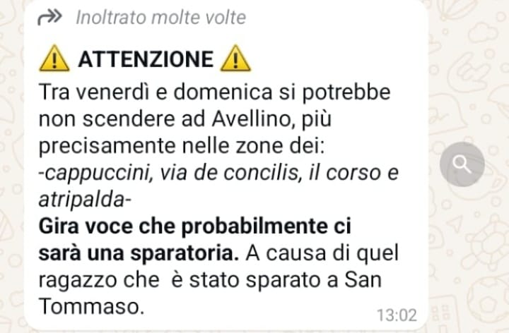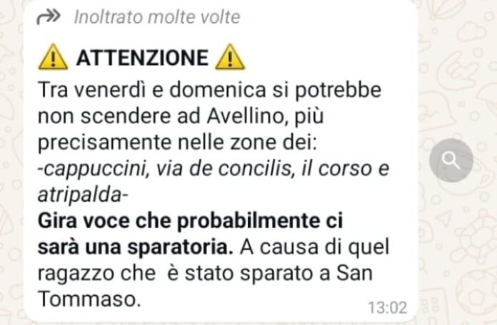 Un messaggio via social che in breve tempo ha fatto il giro di centinaia di telefonini. Non è un’allerta meteo però. E se è una trovata goliardica e’ sicuramente di pessimo gusto. Si tratta di un avviso che nel fine settimana non si dovrebbe frequentare Avellino perché ci sono rischi di agguati in risposta al ferimento avvenuto a Rione Mazzini. Un messaggio a quanto pare già in mano agli inquirenti. Nelle prossime ore il legale del diciannovenne ferito a Rione Mazzini, il penalista Michele Scibelli, presenterà un formale esposto alla Procura della Repubblica di Avellino per chiedere di individuare l’autore del messaggio e perseguirlo legalmente. Quello che e’ certo, almeno per ora, e’ che l’autore dello stesso rischia una denuncia per procurato allarme e calunnia. Del resto, che anche la criminalita’ sia ormai 2.0 era un fatto noto, ma che diramasse allerte “agguati” appare abbastanza inverosimile.