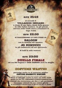 O ancora … sfidare Bud Spencer in una gara all’ultimo fagiolo, volare con le sinfonie del maestro Morricone e gustare le prelibatezze dei numerosi stand enogastronomici. Sfide e confronti tra cow boy e banditi, le tradizioni dei pellerossa. Un tuffo nella cultura e nelle tradizioni che hanno accompagnato generazioni che si concluderà alla fine di ogni serata con la proclamazione del vincitore del concorso “miglior costume spaghetti western”.