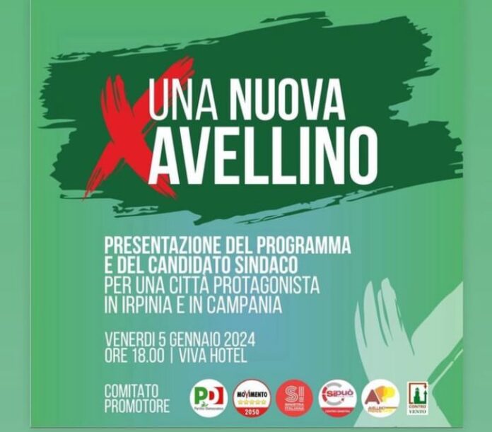 “Una Nuova Avellino”, la coalizione che mette insieme Pd, M5S, Sinistra Italiana, SiPuò, App e Controvento, venerdì 5 gennaio presenta ufficialmente il proprio candidato a sindaco di Avellino, Benny De Maio, ed il programma per “una città protagonista”.