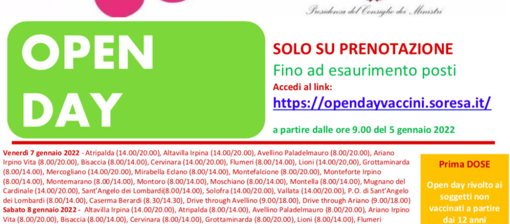 Sabato 8 gennaio 2022 saranno attivi i Centri Vaccinali di Altavilla Irpina (14.00/20.00), Atripalda (8.00/14.00), Avellino Paladelmauro (8.00/20.00), Ariano Irpino Vita (8.00/20.00), Bisaccia (8.00/14.00), Cervinara (8.00/14.00), Grottaminarda (8.00/20.00), Lioni (8.00/14.00), Flumeri (8.00/14.00), Mirabella Eclano (8.00/14.00), Montefalcione (8.00/20.00), Monteforte Irpino (8.00/20.00), Montella (8.00/14.00), Montemarano (8.00/14.00), Montoro (8.00/14.00), Mugnano del Cardinale (8.00/14.00), Sant’Angelo dei Lombardi (8.00/14.00), Vallata (14.00/20.00).
