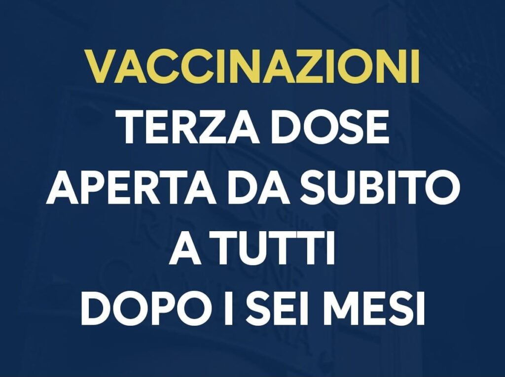 Nel corso della riunione convocata dal Presidente Vincenzo De Luca con i dirigenti delle Asl e delle Aziende Ospedaliere della Campania è stato confermato che le vaccinazioni con terza dose, trascorsi i sei mesi dall’ultima somministrazione, sono aperte a tutti i cittadini della Campania senza limiti di fasce di età o di categorie.