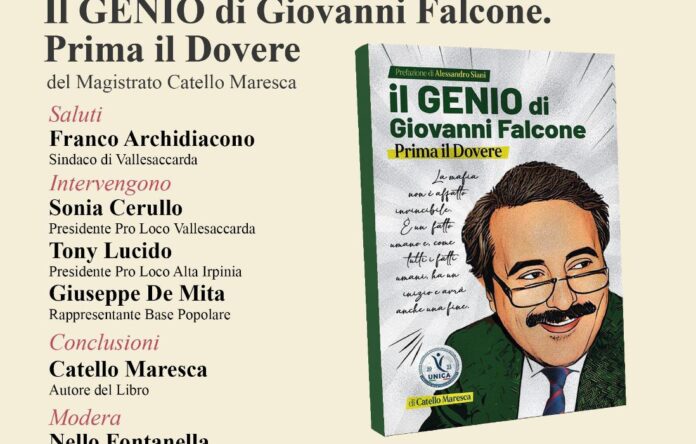Dopo l’evento dedicato al libro di Andrea Covotta, Politica e Pensiero, il 23 settembre prossimo, con inizio alle 18.00, a Vallesaccarda, presso l’Hotel Ristorante Minicuccio, ci sarà la presentazione del libro “Il Genio di Giovanni Falcone- Prima il dovere”, scritto dal Magistrato anticamorra Catello Maresca per la diffusione della Cultura Antimafia.