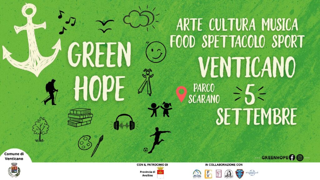 Green Hope, parte integrante del fitto calendario di eventi dell’Estate Venticanese, in programma il 5 settembre presso il “Parco Scarano”, è promossa dal Comune di Venticano in sinergia con le associazioni locali. Filo conduttore, la scoperta e la valorizzazione del territorio attraverso una serie di esperienze tutte da vivere. Chiaramente evocativo il nome scelto, verde come l’Irpinia, come il colore della speranza. L’ancora, il simbolo per antonomasia di chi ha deciso di “fermarsi in un luogo”, di restare.