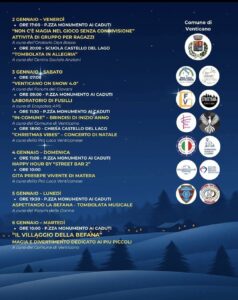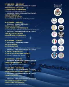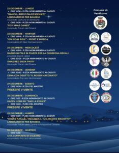 Laboratori creativi per bambini, spettacoli, concerti e cene tematiche si alterneranno a presepi viventi, gite tra le luminarie, feste in piazza, happy hour e le immancabili tombolate natalizie. Ogni sera, Piazza Monumento ai Caduti e Piazza del Mastro diventeranno il cuore pulsante delle festività, mentre le strade di Venticano si vestiranno di luci e allegria.
