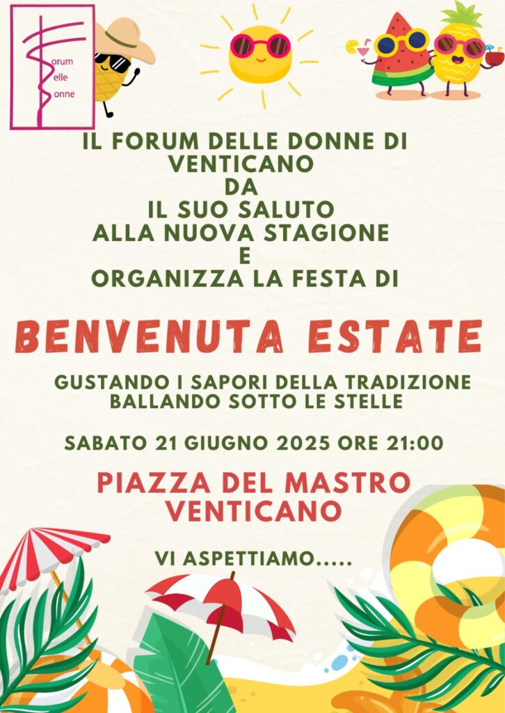 Il Forum delle Donne di Venticano saluta l’arrivo della nuova stagione con un’iniziativa all’insegna della convivialità, della tradizione e del divertimento. Sabato 21 giugno, alle ore 21, in Piazza del Mastro, si terrà la Festa di “Benvenuta Estate”, un evento aperto a tutta la cittadinanza per celebrare insieme l’inizio dell’estate.