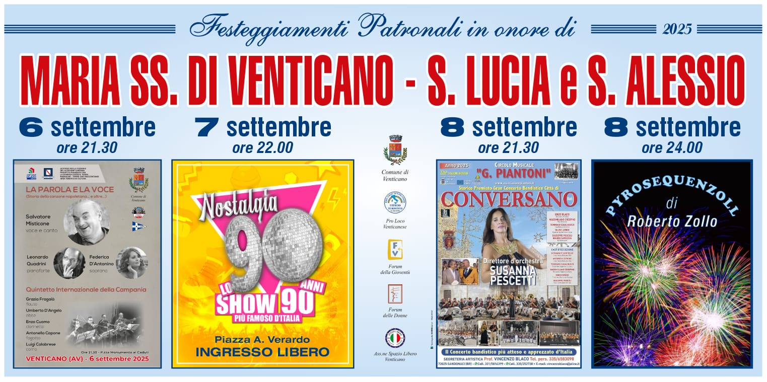 Dal 6 all’8 settembre 2025, Venticano tornerà a risplendere con i colori delle luminarie, il suono festoso delle campane e l’atmosfera intensa dei riti religiosi, in occasione dei solenni festeggiamenti in onore di Maria Santissima di Venticano, Sant’Alessio e Santa Lucia Vergine e Martire. Un appuntamento atteso da tutta la comunità, che ogni anno rinnova con passione e partecipazione una tradizione che affonda le radici nella storia del paese.