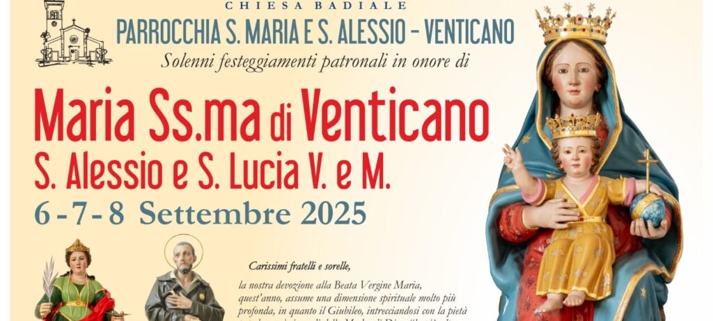 Dal 6 all’8 settembre 2025, Venticano tornerà a risplendere con i colori delle luminarie, il suono festoso delle campane e l’atmosfera intensa dei riti religiosi, in occasione dei solenni festeggiamenti in onore di Maria Santissima di Venticano, Sant’Alessio e Santa Lucia Vergine e Martire. Un appuntamento atteso da tutta la comunità, che ogni anno rinnova con passione e partecipazione una tradizione che affonda le radici nella storia del paese.