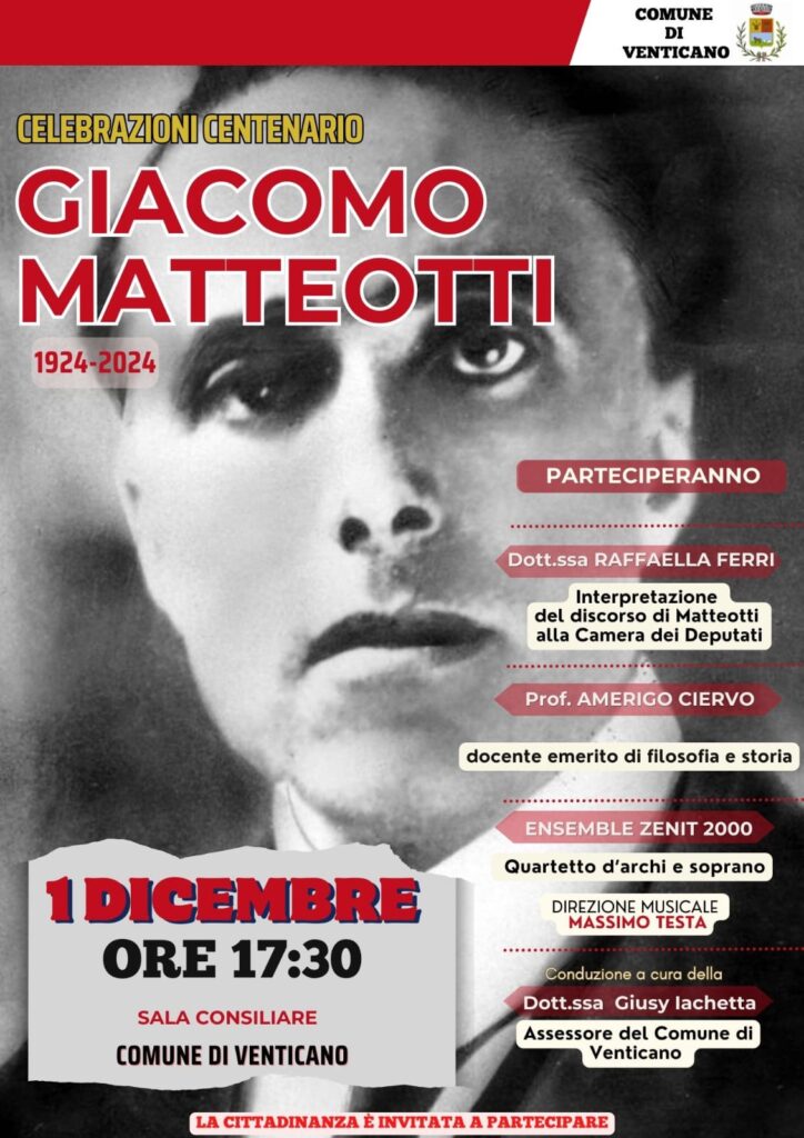 Domenica 1 dicembre, alle ore 17:30, la Sala Consiliare di Venticano ospiterà un evento di grande rilevanza per celebrare il centenario della morte di Giacomo Matteotti, uno dei protagonisti più significativi della storia politica italiana.