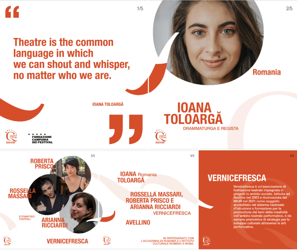“Quartieri di Vita, Life infected with social theatre!” è il festival di formazione e teatro sociale della Fondazione Campania dei Festival, ideato dal direttore artistico Ruggero Cappuccio, e realizzato con il sostegno della Regione Campania in partnership con i Cluster Eunic – Istituti Nazionali di Cultura dell’Unione Europea di Roma e Napoli, che ha coinvolto 9 Paesi europei e tutte le province della Regione Campania.