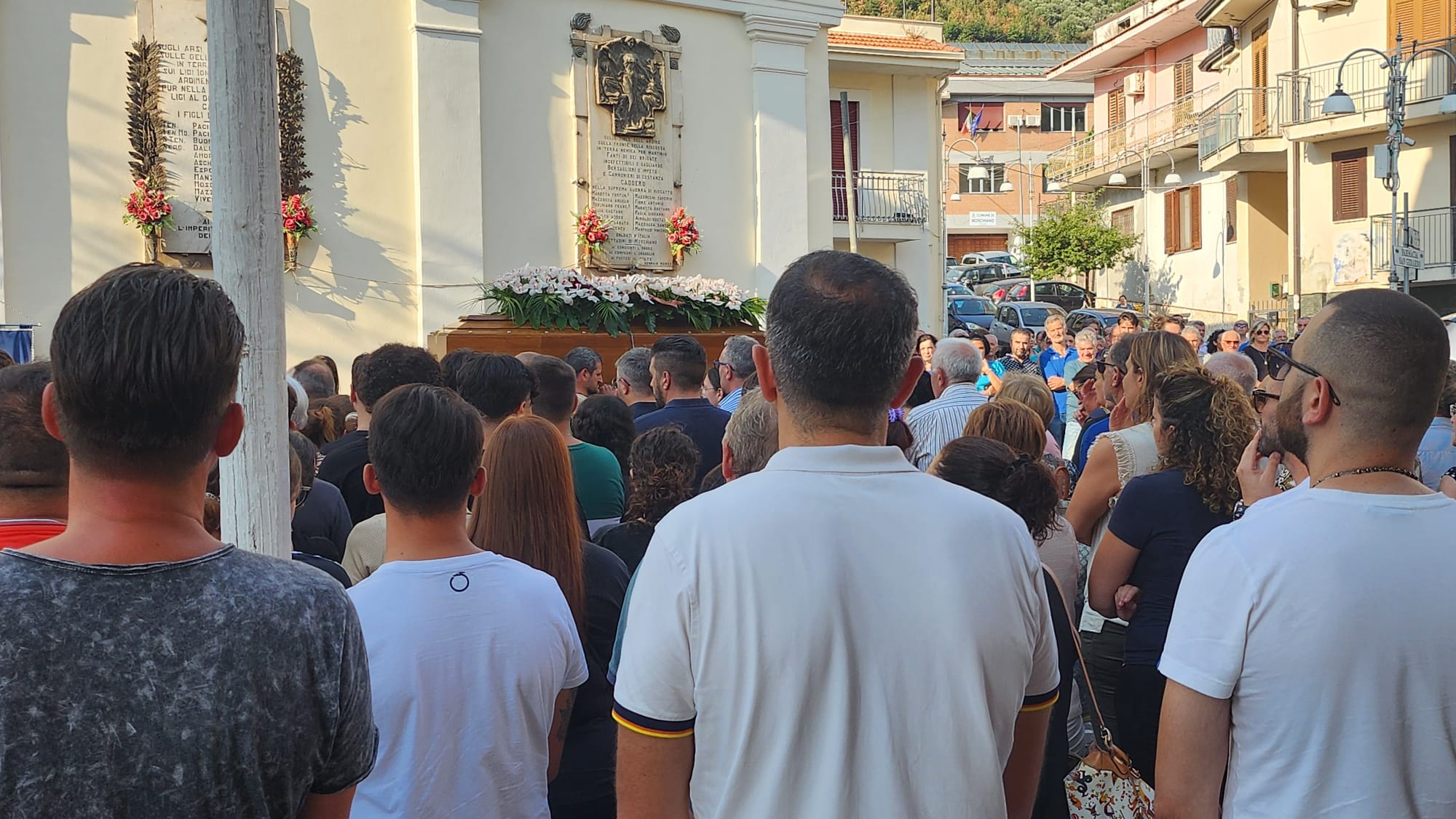 In Chiesa ci sono anche il sindaco Sergio Pacia e i componenti della sua amministrazione. A Moschiano e’ giunto anche il sindaco di Lauro Rossano Boglione. Lutto cittadino e paese in silenzio, come in questi giorni di shock per quanto avvenuto il primo agosto. Sono ancora le parole dell’ omelia di Don Vito a rappresentare il momento di dolore per tutta la comunità: “Ed eccoci, mentre vediamo adesso il nostro Mimmo andare via, come un battello che incamminatosi sul largo del mare va via, senza lasciare traccia. Signore facciamo una tenda per lui e per noi. Non far finire la gioia e la pace, che per tanti anni Mimmo ha donato a coloro che lo hanno conosciuto. Il Signore mi ha provato duramente, ma non mi ha consegnato alla morte (Sal 117,18) Una domanda scalcia nei nostri cuori nelle nostre mente. Perché Signore? Perché dovevamo vivere questo dolore, così angosciante, opprimente, paradossale e ineffabile? Rispondici, tu che hai detto di essere il Dio della vita, tu che hai promesso mentre eri su questa terra che nessun credente in te andrà perduto. Non bisognava che il Cristo sopportasse queste sofferenze per entrare nella sua gloria? (Lc 24,26) Signore della eterna vita, il nostro perché angosciato trova risposta solo nella tua parola, diradando la nube della tempesta e trasformandola in nube gloriosa, preludio di una visione eterna e sconfinata. Questa sofferenza atroce ha senso perché sappiamo che tu non hai abbandonato il nostro Mimmo in quel momento, perché battezzato in te, il suo spirito è immortale. E per questo in lui vediamo ora realizzarsi la tua trasfigurazione: Mimmo doveva mostrarci in una sera di agosto che non è vana la fede dei cristiani: noi risorgeremo, noi siamo fatti per l’eternità”.