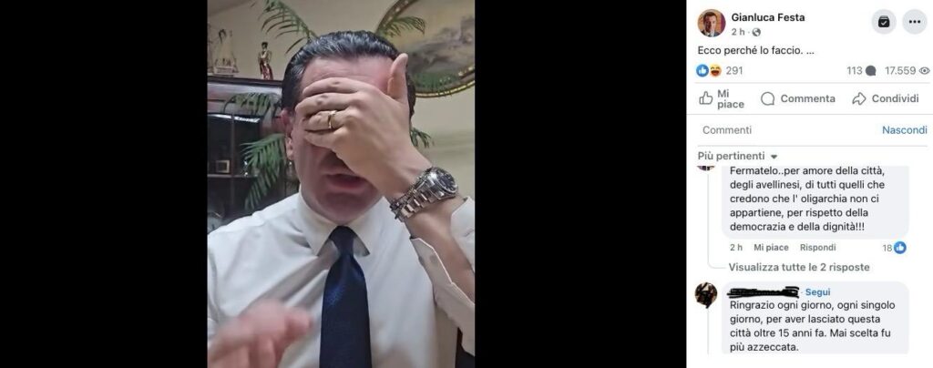 «Fermatelo, per amore della città, degli avellinesi, di tutti quelli che credono che l’oligarchia non ci appartiene, per rispetto della democrazia e della dignità!», scrive un altro commentatore. E infine, in fondo, qualcuno aggiunge: «Hai perso altri 5000 voti». E ancora, una domanda rimasta senza risposta per volere dello stesso Festa: «Perché sei scappato dall’ufficio con il pc?».”