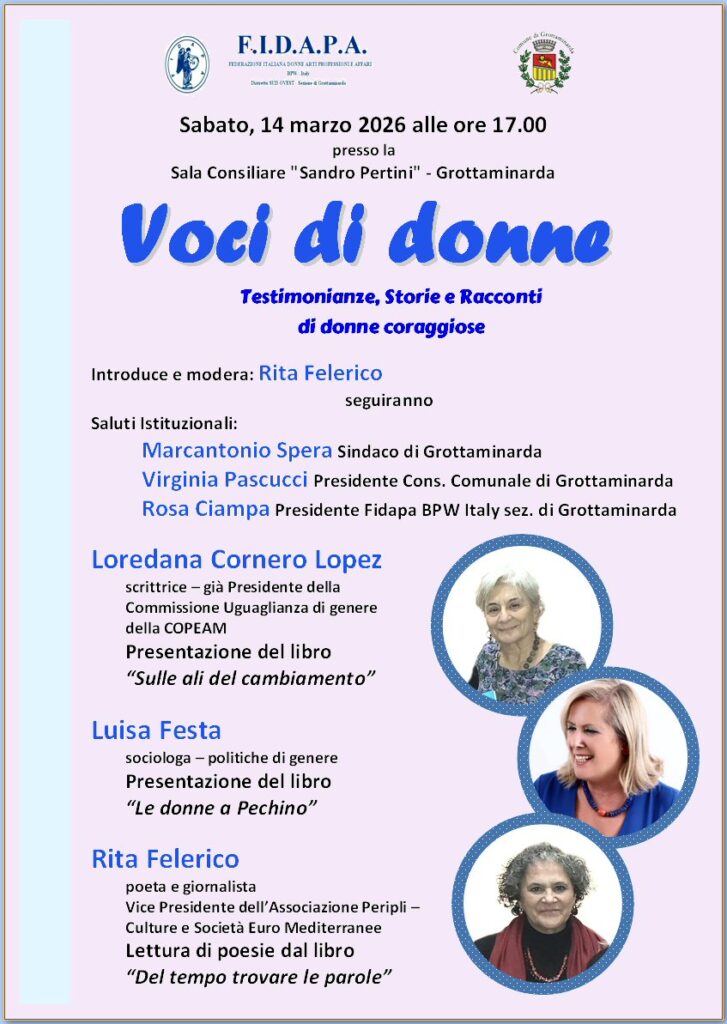 Dopo i saluti istituzionali di Marcantonio Spera, Sindaco di Grottaminarda, Virginia Pascucci, Presidente Consiglio Comunale di Grottaminarda e Rosa Ciampa, Presidente Fidapa BPW Grottaminarda, interverranno, infatti, Loredana Cornero Lopez, scrittrice, già Presidente della Commissione Uguaglianza di genere, della COPEAM che presenterà il suo libro “Sulle ali del cambiamento”, Luisa Festa, sociologa, esperta di politiche di genere che presenterà il suo libro “Le donne a Pechino” e Rita Felerico, poeta e giornalista, Vice Presidente dell’Associazione “Peripli, Culture e Società Euro Mediterranee” che leggerà alcune poesie tratte dal suo libro “Del tempo trovare le parole” e modererà anche l’incontro.